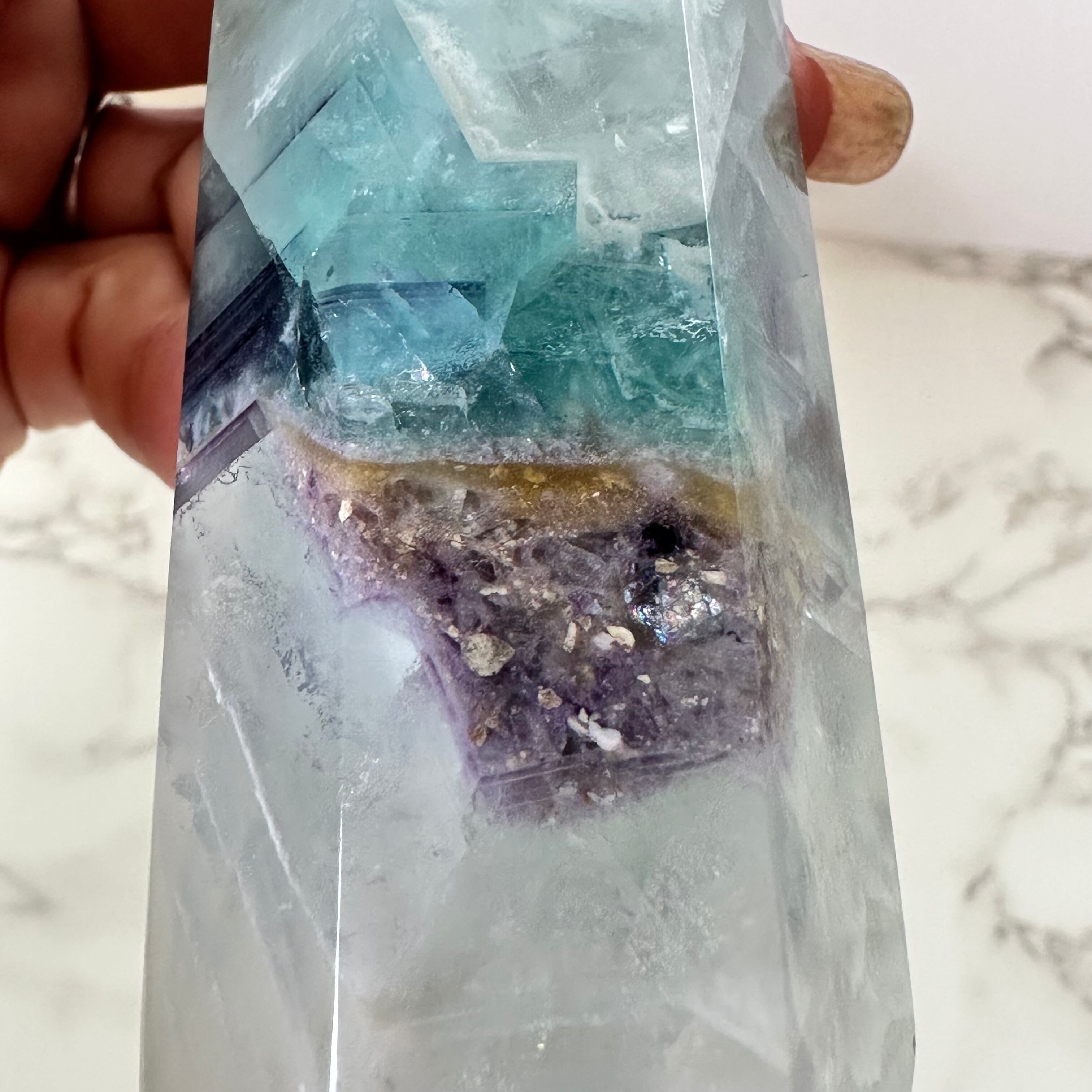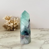 淡いミントブルーと虹がたくさん見られるフローライトタワーです。