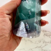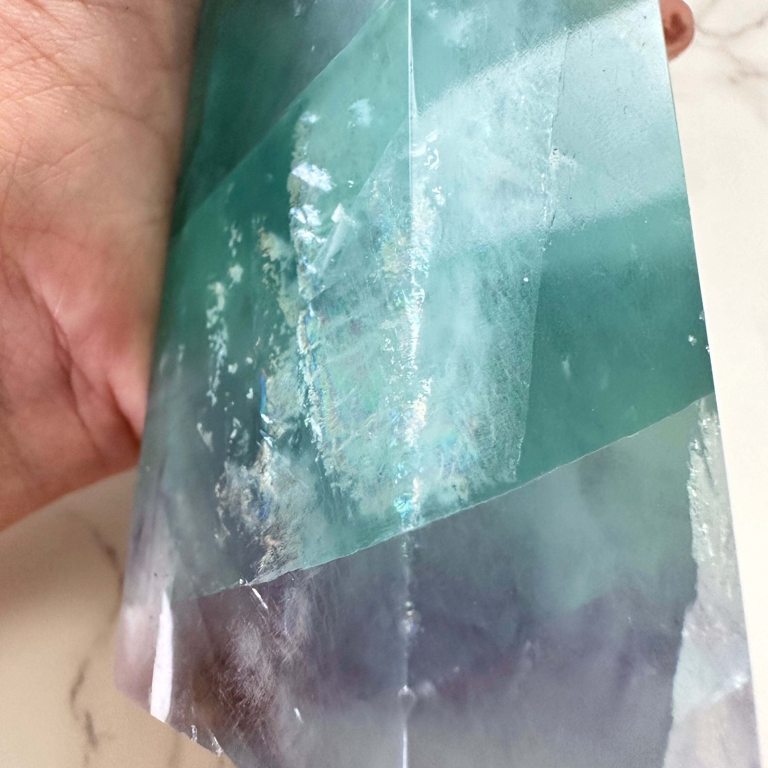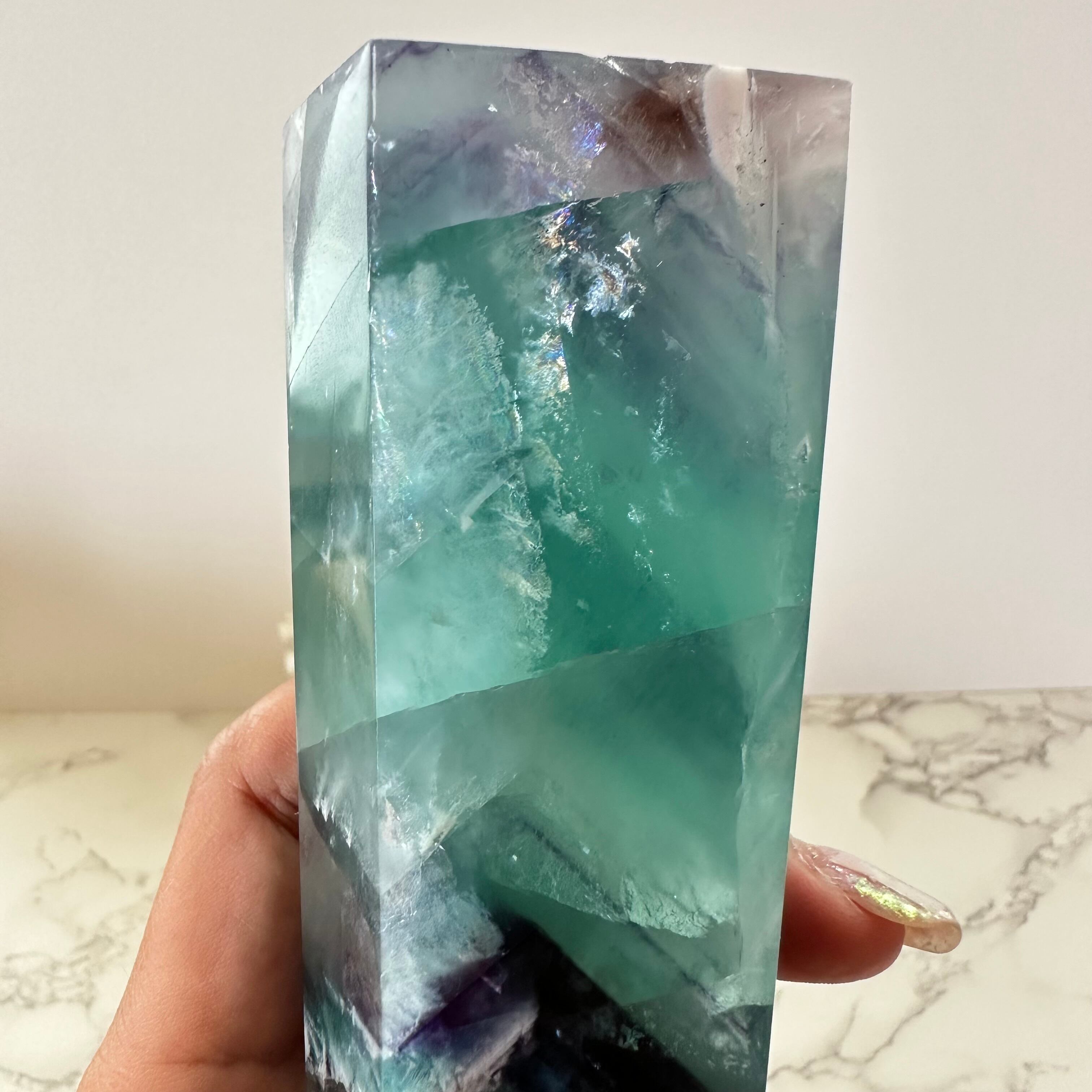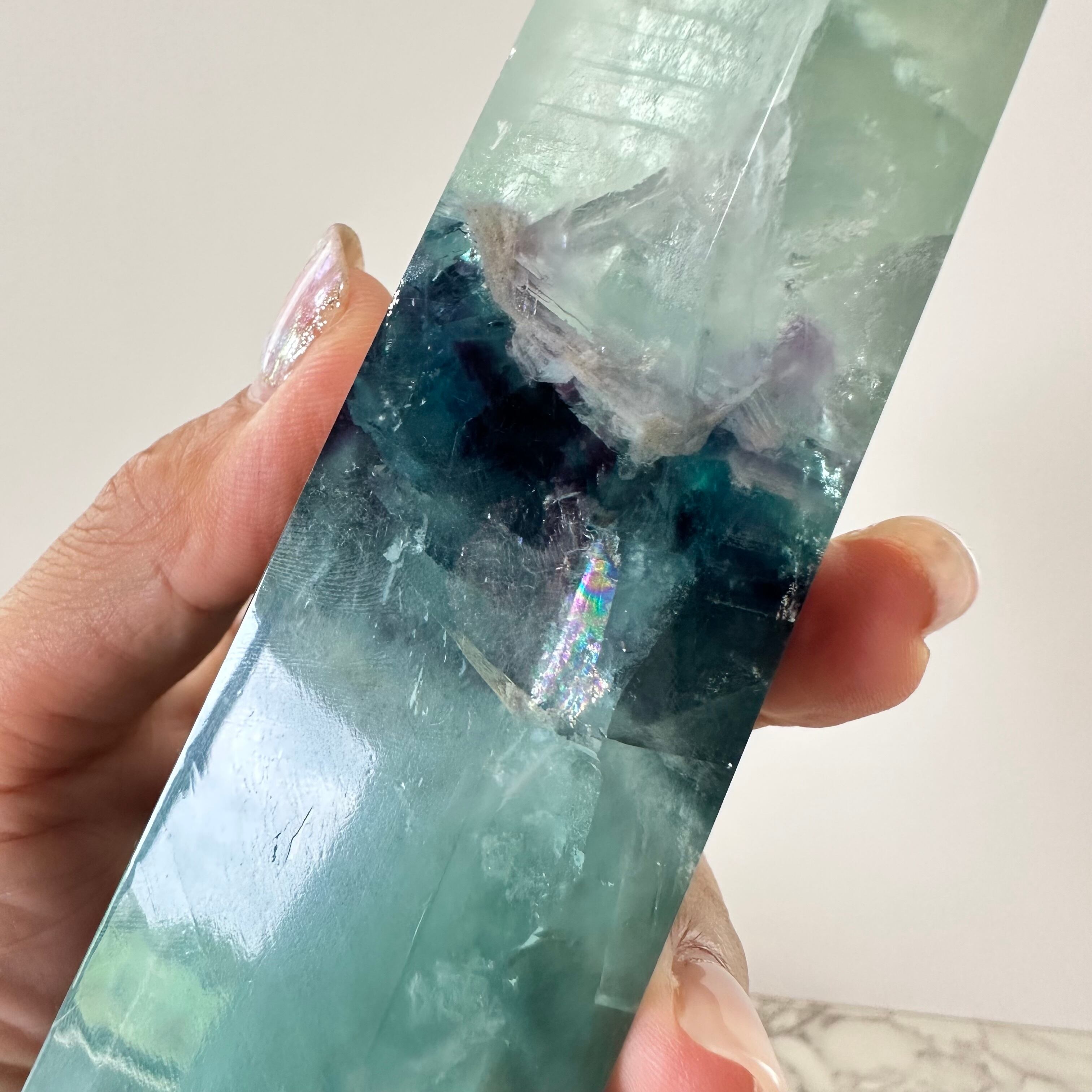 ミントブルーに深い蒼が海を連想させる背の高い大きめフローライトタワーです。