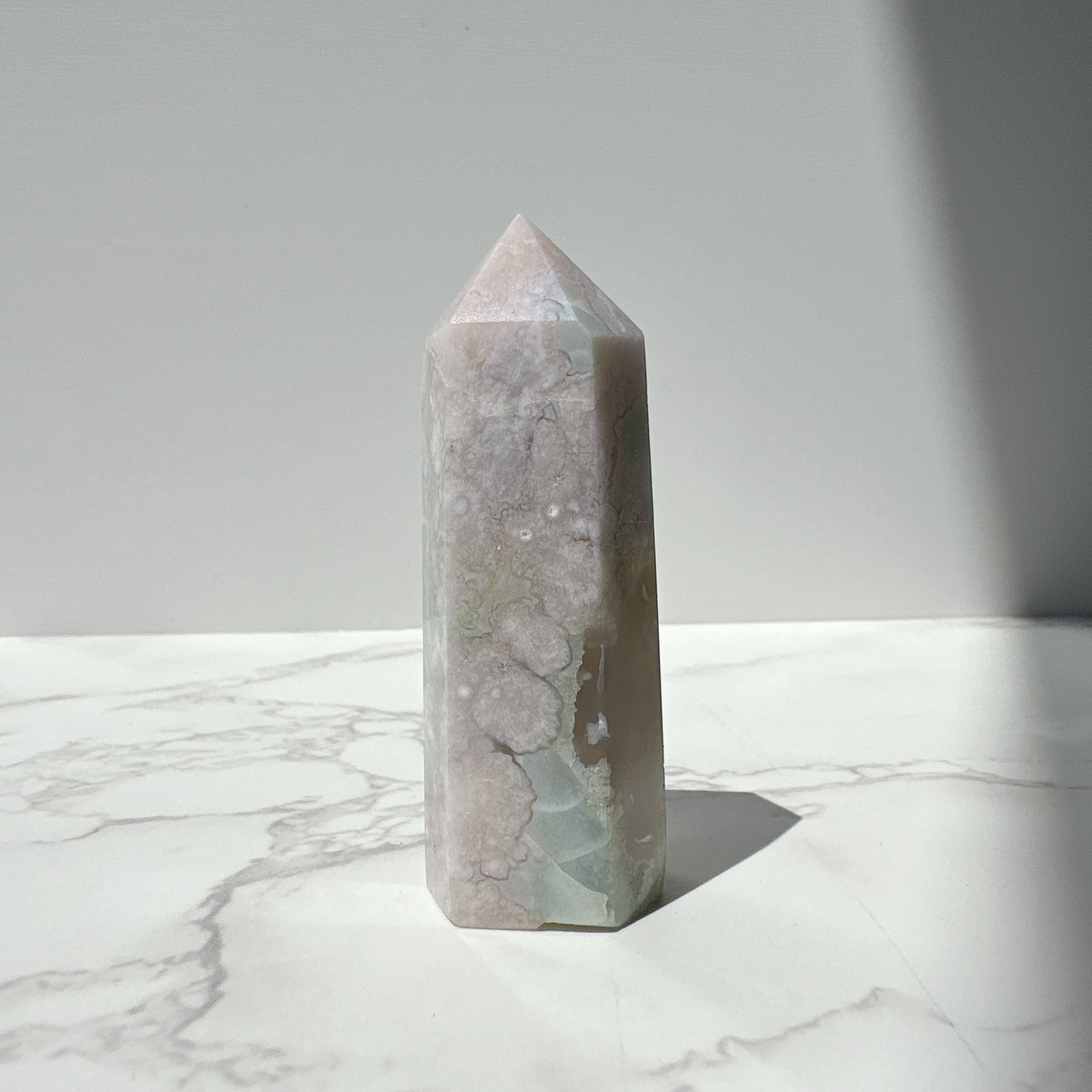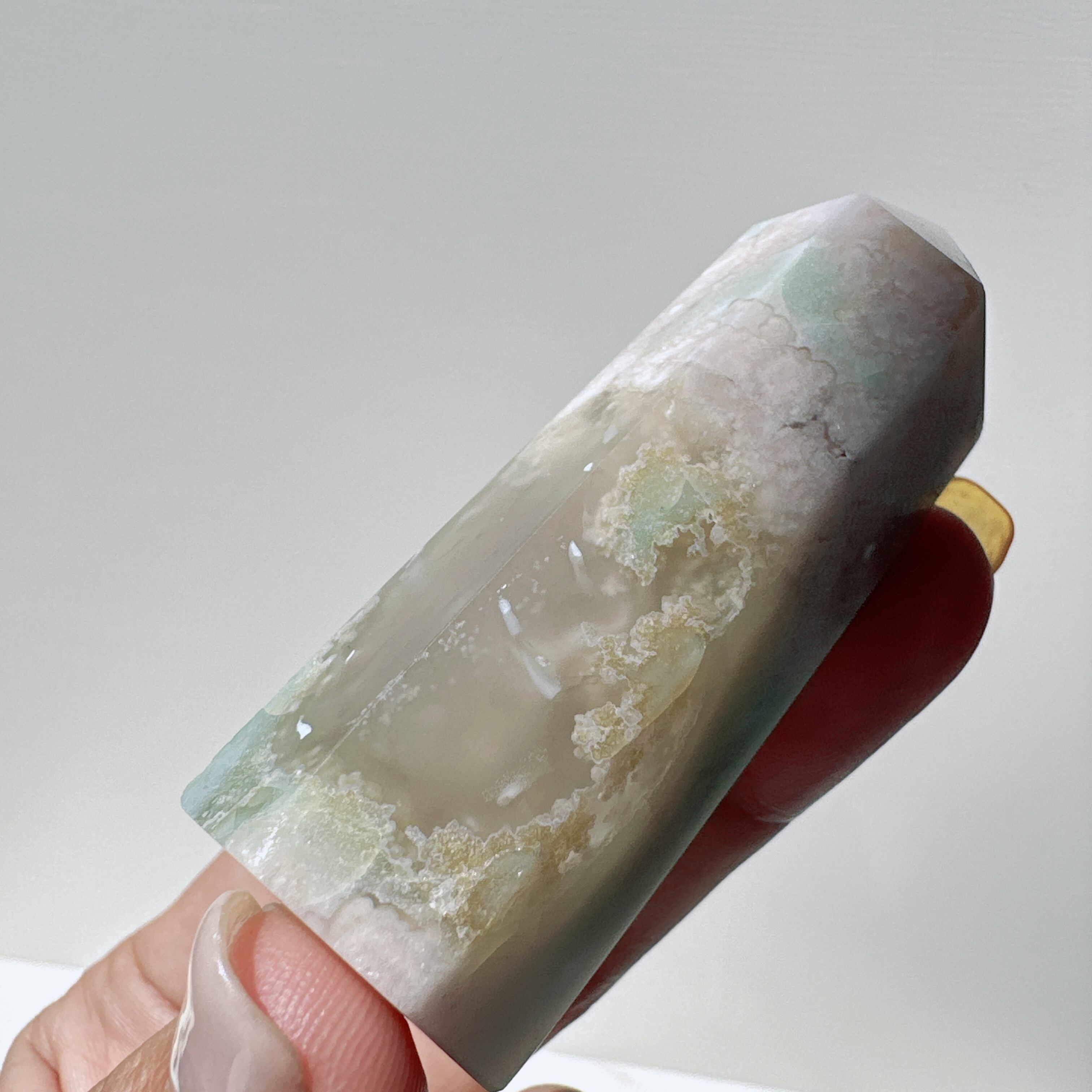 満開の桜の花びらのような優しいピンクと淡いグリーンが合わさったグリーンフラワーアゲートです