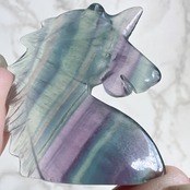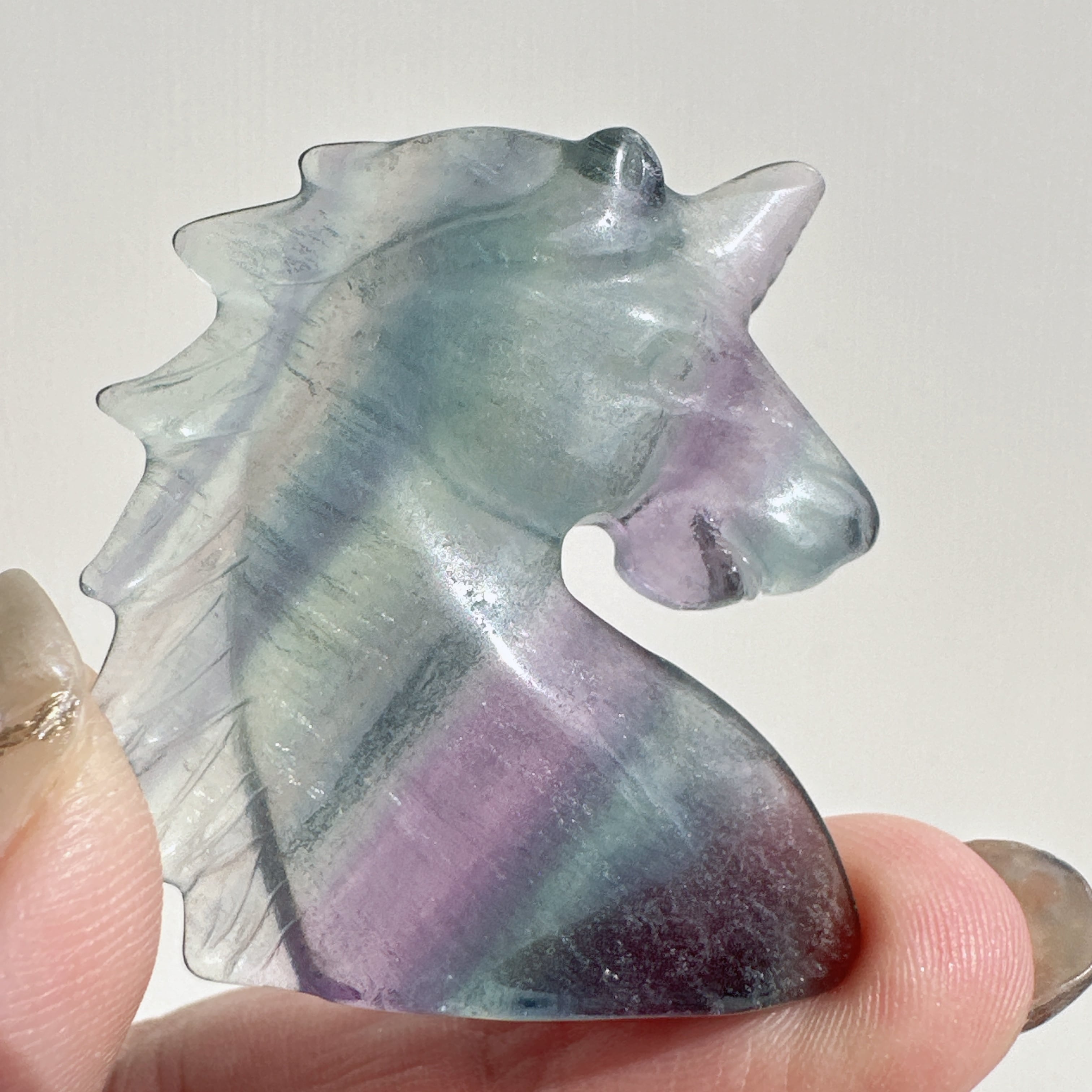 グリーン・ブルー・パープル・ピンクの縞模様が綺麗なフローライトのユニコーンです。